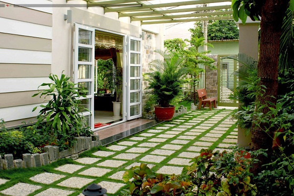 Mẫu sân vườn 6 : Lát đá , trồng cỏ xen kẽ.